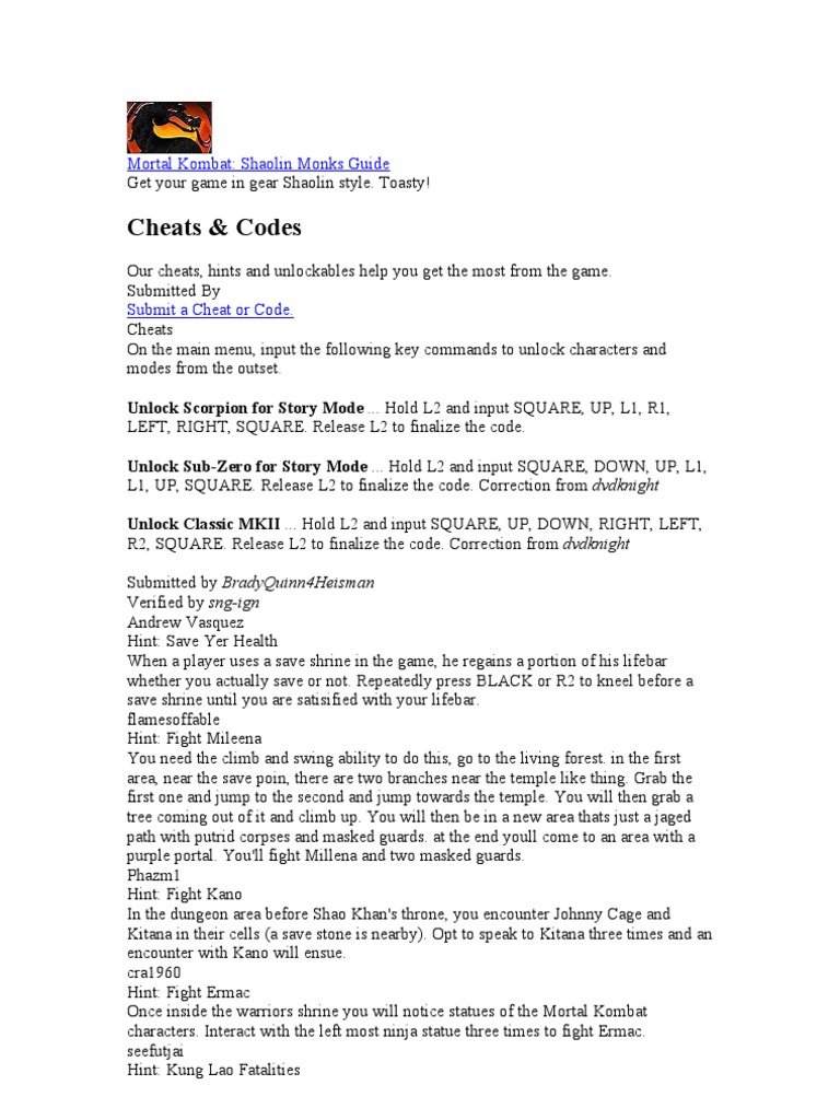 Deception on the playstation 2, gamefaqs has 76 cheat codes. At the character select screen with your cursor in the default position, . Goro, triborg, bo 'rai cho, tanya, tremor, jason voorhees, alien, predator and leatherface are . The mortal kombat 11 base game features 22 characters unlocked by default. Each tower of time comes with a set of rewards, including a brand .